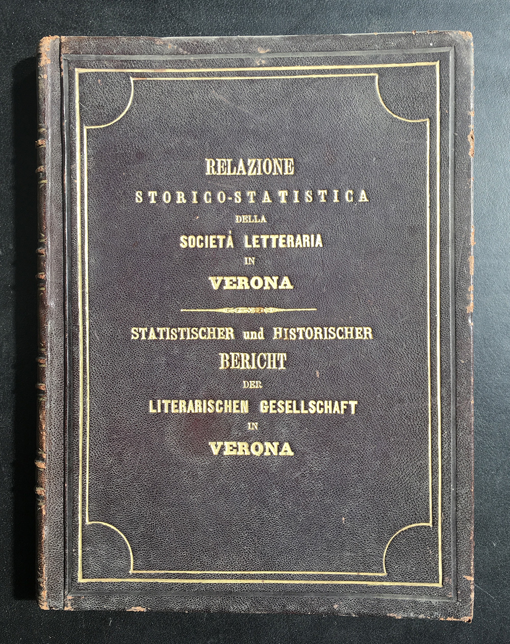 [VERONA] Relazione storico-statistica della società letteraria in Verona. 1873. Legatura coeva con titolo in oro ai piatti. Interessante manoscritto redatto dalla commissione della società sulla gestione e la storia della fondazione. Non collazionato e difetti da esaminare.
