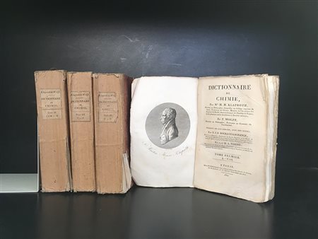 KLAPROTH, M. H.; WOLFF F. Dictionnaire de chimie. Parigi: Klostermann, 1810. 4to, 4 voll ritratto in antiporta. Brossura editoriale coeva con titiolo stampato su tassello al dorso. Celebre manuale di chimica del professor Klaproth a cui si deve l ascoperta dell'uranio e lo zirconio. Non collazionato e difetti da esaminare.