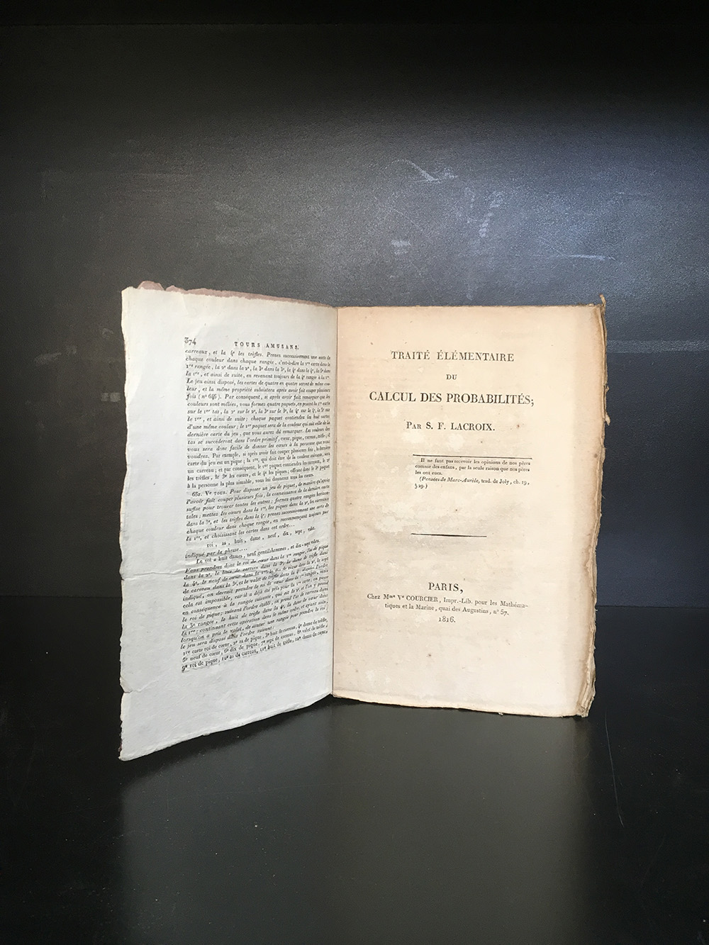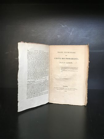 LACROIX, Silvestre-François.Traité élémentaire du calcul des probabilités.Paris: Courcier, 1816. 8vo. brossura editoriale coeva con titiolo stampato su tassello. Prima edizione di questo influente trattato di probabilità. Non collazionato e difetti da esaminare.