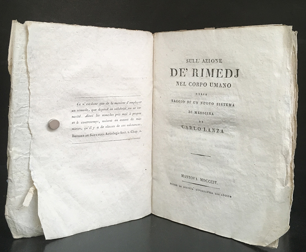 LANZA Carlo. Sull'azione de' rimedi nel corpo umano. Mantova: Società tipografica all'Apollo, 1804. 4to, cartone coevo. Non collazionato e difetti da esaminare.