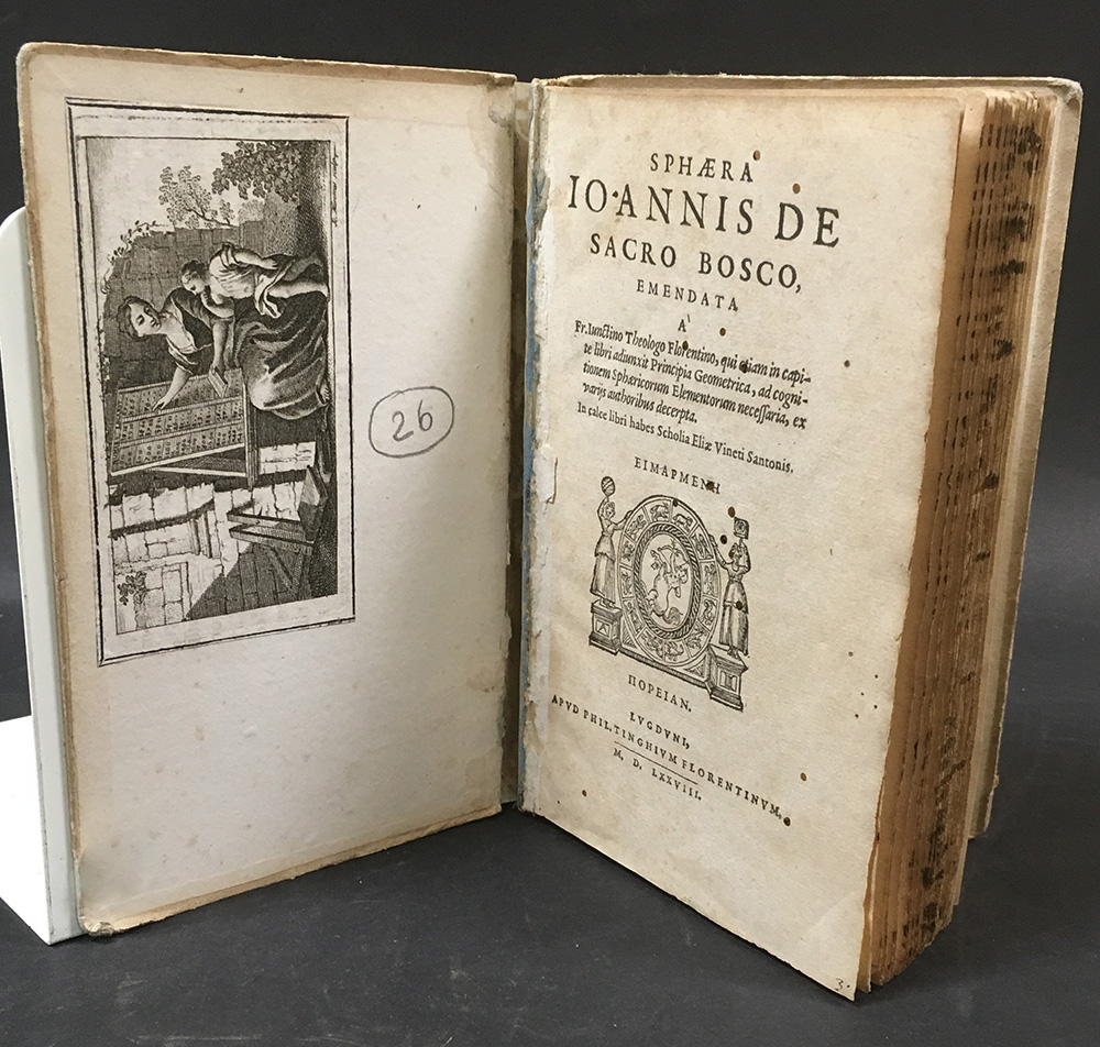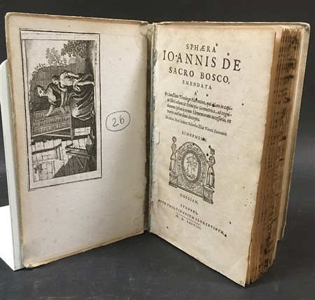 SACROBOSCO, Johannes de (c.1195 - c.1256) - De Sphaera emendata. Lione: Phil. Tinghius florentinus, 1578. Seconda edizione corretta e rivista dall'astronomo e teologo Francesco Giuntini che pubblicò la prima edizione nel 1577; i commentari sono del filologo Élie Vinet. La prima edizione del Sacrobosco fu del 1472 e visto l'enorme successo fu ripubblicata 15 volte entro l'anno 1500 e 20 nel XVI secolo. 8vo (166 x 113mm). Vignetta incisa in legno al frontespizio con segni zodiacali, numerose figure nel testo e 4 parti mobili alla xilografia in d4 (fori di tarlo nel testo e buco con perdita in C1). Legatura in mezza pergamena moderna, titolo manoscritto al taglio esterno. Provenienza: ex libris inciso da Mercorus. Il libro è venduto non passibile di storno essendo incerto il numero totale di volvelle presenti. Non collazionato e difetti da esaminare.