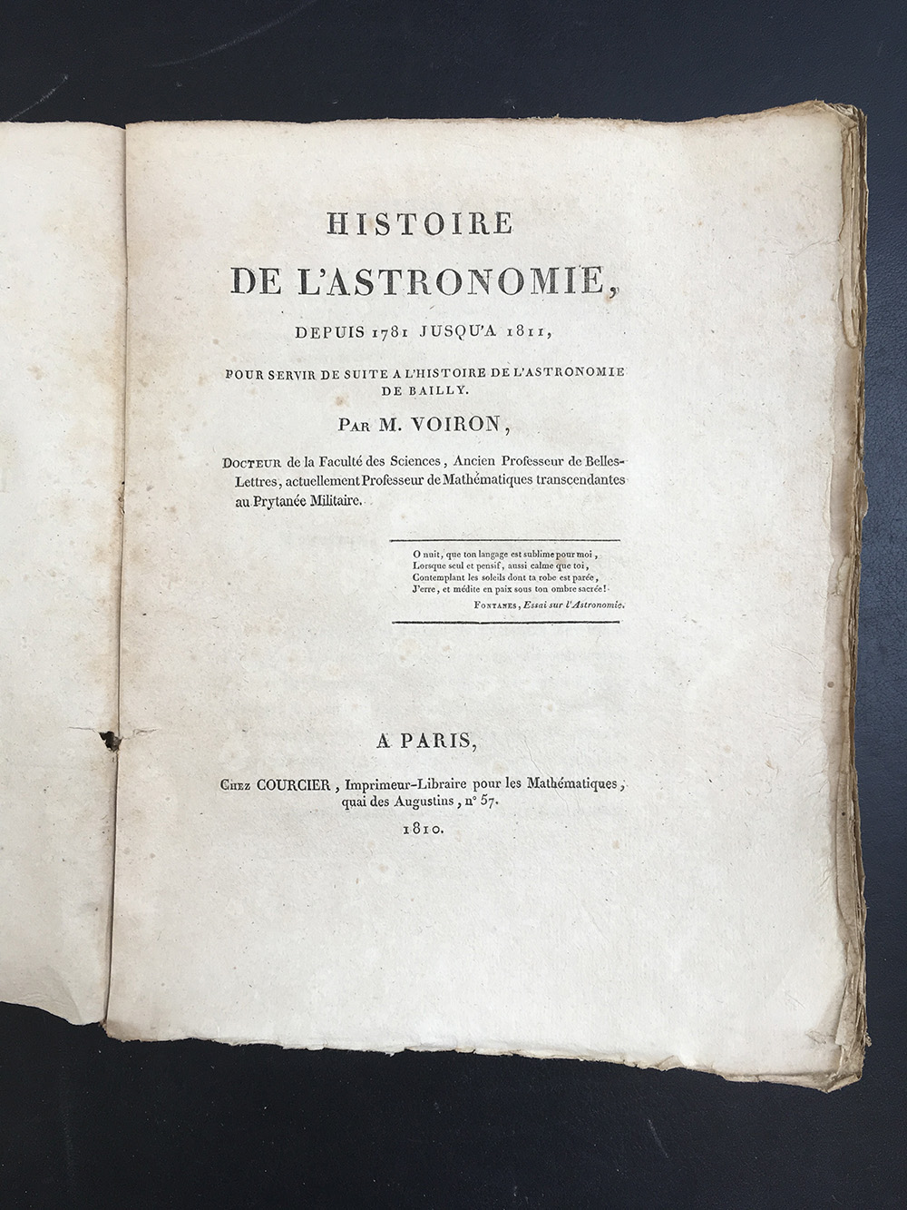 VOIRON, B. Histoire de l'astromonie depuis 1781 jusqu'à 1811. Paris, Courcier, 1810. 4to, brossura coeva azzurra. Non collazionato e difetti da esaminare.