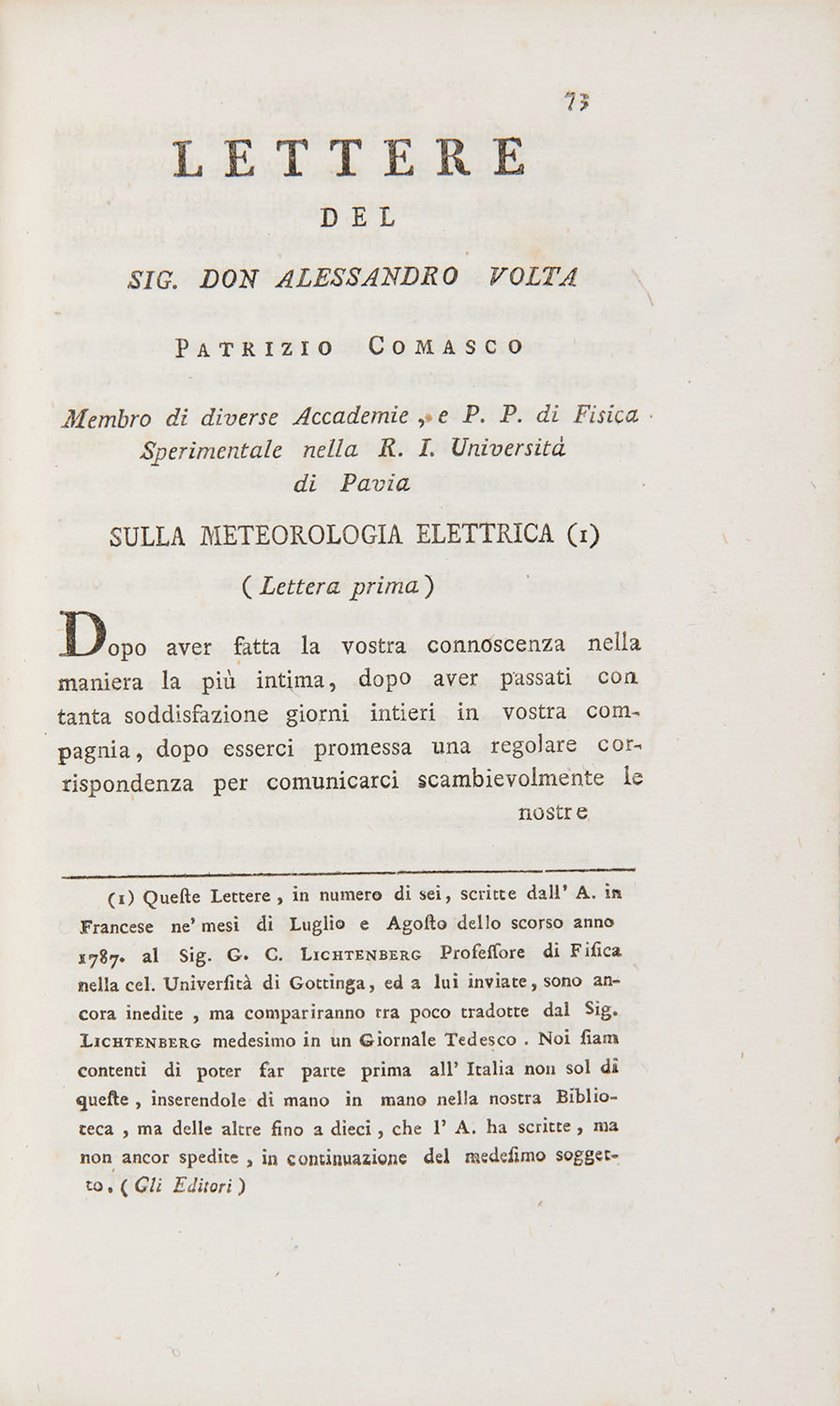 [VOLTA, Alessandro] (1745-1827) - [Lettere sulla meteorologia elettrica] in Biblioteca Fisica d'Europa. Pavia: Monastero di S. Salvatore, 1788.
