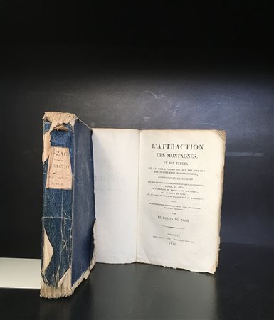 ZACH Francois de. L'attraction des montagnes et ses effets. Avignone: Seguin aine, 1814. 8vo, 3 tavole ripiegate. Brossura coeva con titolo stampato su tassello al dorso. Importante trattato sulla geodetica. Non collazionato e difetti da esaminare.