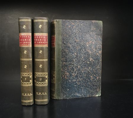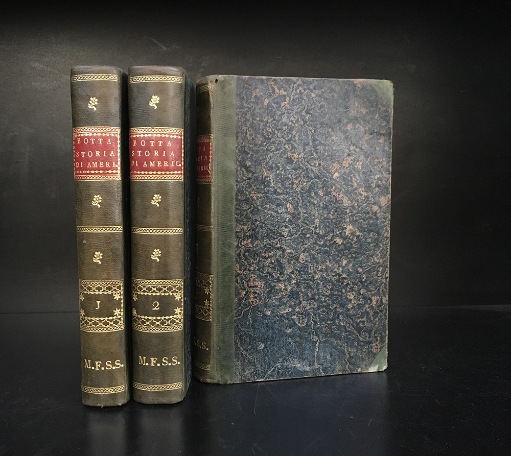 BOTTA C. Storia della guerra della independenza degli Stati Uniti d'America. Milano: Bettoni, 1820. 8vo, 3 voll. 2 carte geografiche più volte ripiegate. Rilegatura coeva con dorso in marocchino verde, decori in oro e titolo su tassello bordeaux. Non collazionato e difetti da esaminare.