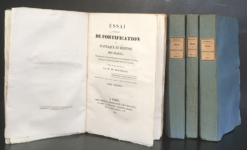 BOUSMARD, M. de. Essai general de fortification et d'attaque et defense des places. Atlas des planches seul. Parigi: Anselin, 1837. 4 volumi in 8vo incluso il bell'altante di 62 carte a doppia pagina. Bella copia in brossura originale di questa seconda edizione. Non collazionato e difetti da esaminare.