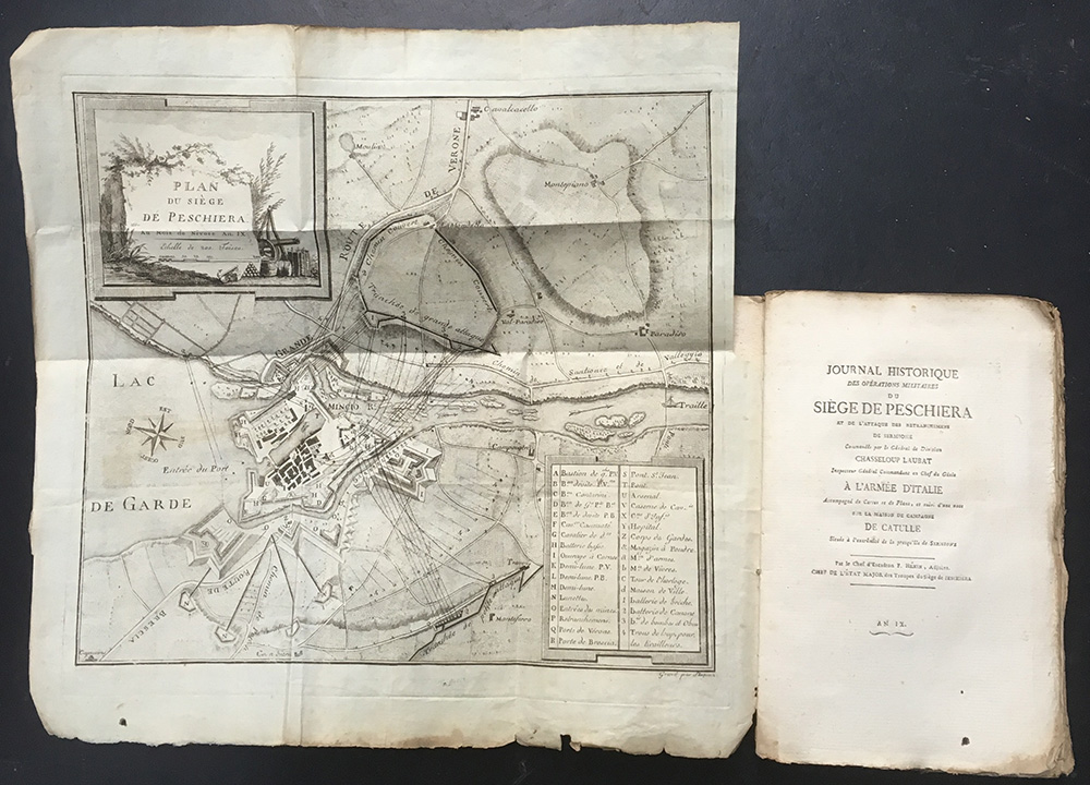 HENIN E.F.de. Journal historique des operations militaires du siege de Peschiera et de l'attaque des retranchemens de Sermione. S.l. s.e. ann IX (1801). 8vo, 3 mappe topografiche più volte ripiegate, 1 tabella più volte ripiegata. Brossura coeva. Memoria del generale Henin sull'assedio di peschiera corredate dalle mappe di Peschiera, Sirmione e della villa di Catullo stampate su carta azzurrina. Non collazionato e difetti da esaminare.