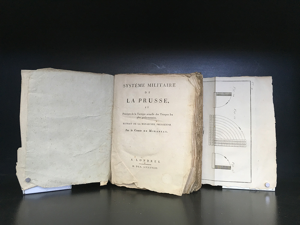 MIRABEAU H. G. Systême militaire de la Prusse, et Principes de la Tactique actuelle des Troupes les plus perfectionnées. Londra: [s.e.] 1788. 4to, 93 tavole più volte ripiegate. Legatura coeva in brossura. Qualche fioritura, esemplare in barbe. Celebre opera di Mirabeau in cui vengono illustrate le tattiche dell'esercito prussiano, frutto della fatica di Federico II e del suo entourage, che gli fecero guadagnare il titolo di miglior esercito d'Europa. Non collazionato e difetti da esaminare.