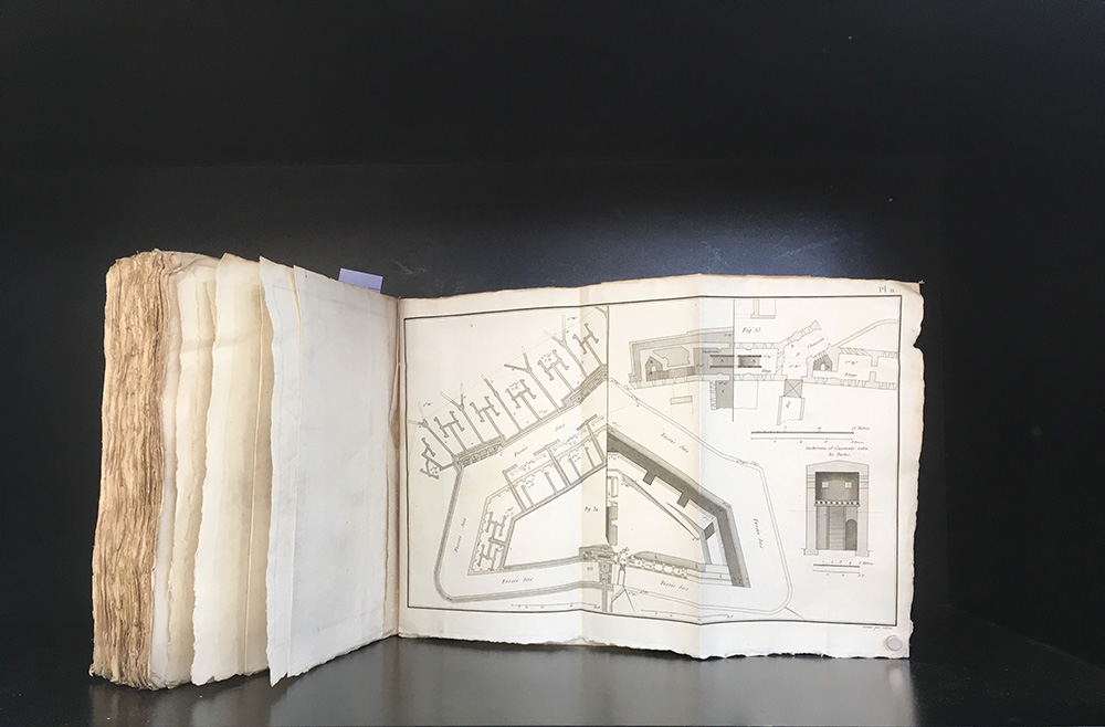 MOUZÉ, M. Traité de Fortification Souterraine, suivi de Quatre Mémoires sur les Mines. Parigi: Levrault, Schoell, Magimel, 1804. 4to, 20 tavole più volte ripiegate di cui 2 acquarellate. Brossura coeva. Buone condizioni interne. Interessante trattato di ingegneria militare sulle mine. Non collazionato e difetti da esaminare.