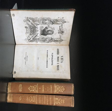 [NAPOLEONICA] LOMBROSO, G. Vita guerriera, politica e privata di Napoleone. Milano: Borroni e Scotti, 1852.-54. 8vo, 2 voll. tavole litografiche nel testo, legatura coeva in mezza pelle con titoli e decori in oro al dorso. SI AGGIUNGE: LOMBROSO G. Vite dei primarj marescialli, ammiragli e generali che si distinsero nelle guerre napoleoniche. Milano: Borroni e Scotti, 1848. tavole litografiche nel testo, legatura coeva in mezza pelle con titoli e decori in oro al dorso. Non collazionato e difetti da esaminare.