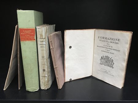 [SAVOIA] Lotto di libri sulla storia militare del Piemonte tra cui: Galleani D'Agliano G. Cibrario L. Memorie storiche sulla guerra del Piemonte dal 1741 al 1747. Torino, Stamperia reale, 1840. 4to, ritratto antiporta cartonato coevo. Non collazionato e difetti da esaminare.