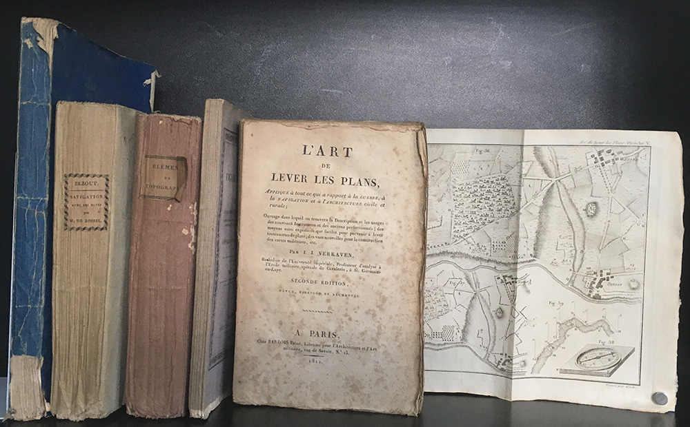 [TOPOGRAFIA - CARTONAUTICA] HAYNE J. E. G. Elemens de topographie militaire. Parigi: Magimel, 1806. 8vo, 11 tavole ripiegate. brossura coeva co titolo stampato su tassello al dorso; VERKAVEN J. L'art de lever les plans. Parigi: Barrois, 1811. 9 tavole più volte ripiegate. brossura coeva, manca il primo piatto; PUISSANT L. Principes du figure du terrain et du lavis. Parigi: Janet et Cotelle, 1827. Brossura coeva stampata una tavola ripiegata. DE ROSSEL M. Traitè de navigation. Parigi: Courcier, 1814. 8vo, 9 tavole ripiegate. Brossura coeva con titolo stampato su tassello; Memoire sur la projection des cartes geographiques. Parigi: Stamperia reale. 1810. 4to, 4 carte geografiche, brossura coeva. Non collazionato e difetti da esaminare.