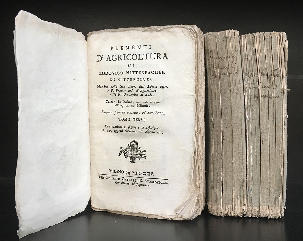 MITTERPACHER, Ludwig. Elementi d'agricoltura, tradotti in italiano, con note relative all'agricoltura Milanese. Milano: Giuseppe Galeazzi, 1794. 3 volumi, 8vo, brossura originale azzurra. Non collazionato e difetti da esaminare.