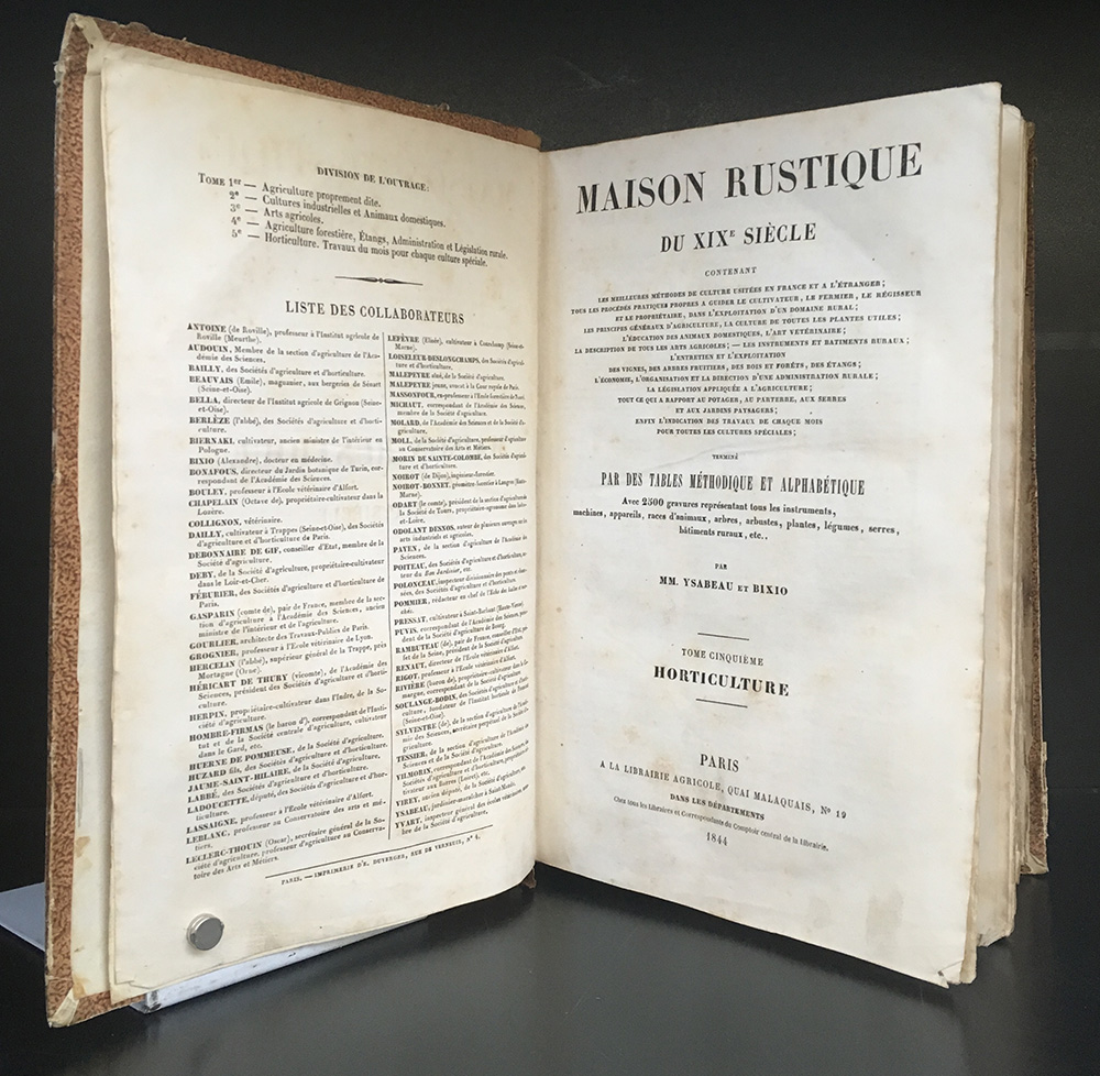 YSABEAU ET BIXIO. Maison rustique du XIX siécle… tome cinquième HORTICULTURE. Parigi: 1844. 8vo con molte illustrazioni di tecniche di potatura, innesto, riproduzione di piante e fiori ecc. Non collazionato e difetti da esaminare.