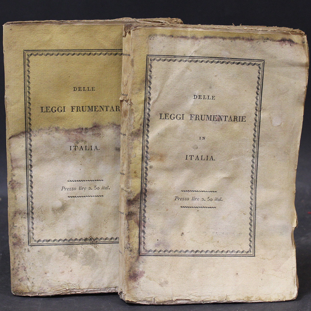 GAMBINI F. Delle leggi frumentarie in Italia. [Torino], s.e., 1819. 8VO 2 VOLL. Brossura editoriale stampata. 2 copie di questo importante testo, tra i primi nel suo genere. Non collazionato e difetti da esaminare.
