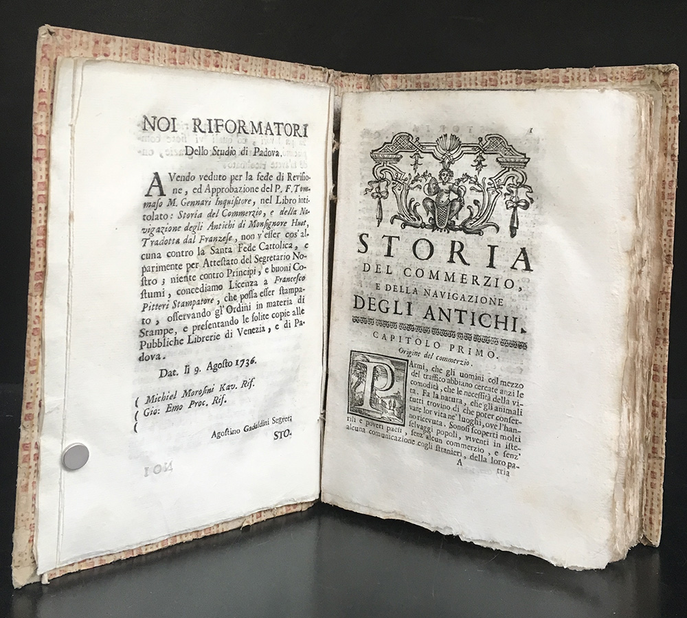 HUET, P. D. Storia del Commerzio e della navigazione degli antichi di monsignore Huet. Venezia: Pitteri, 1737. 8vo, vignetta al frontespizio, testatine e capilettera figurati. Brossura coeva con titiolo manoscritto su tassello al dorso. Rara prima edizione italiana curata da Antongiuseppe Belloni