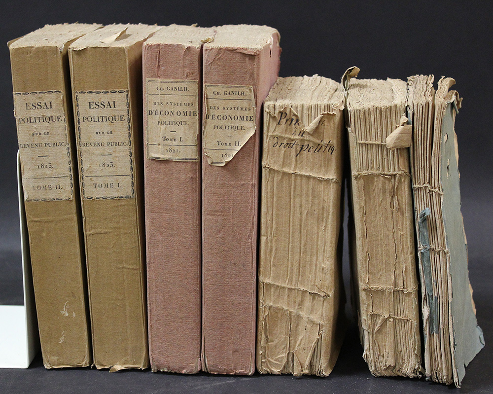 Lotto di alcuni volumi di economia fra cui GANILH. Essai Politique. Parigi: Treuttel, 1823 in 2 volumi in 8vo e brossura coeva. Insieme a un'altra opera dello stesso autore e fra gli altri BURLAMAQUI. Non collazionato e difetti da esaminare.