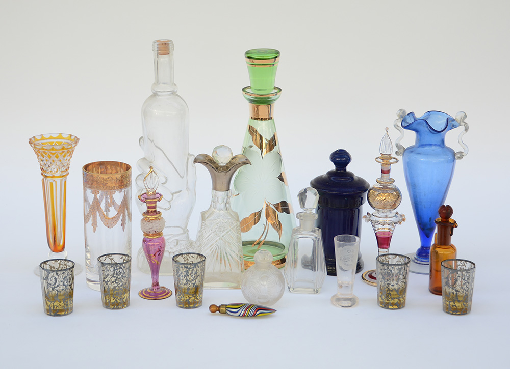 Lotto composto da bottigliette e bicchierini in vetro con decori diversi (difetti)