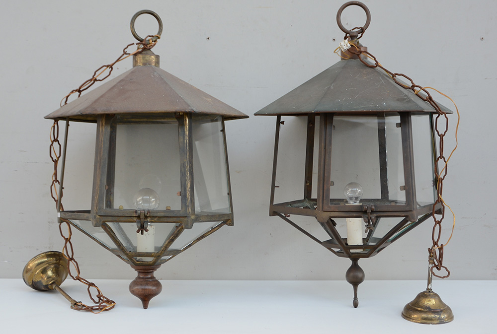 Lotto di due lanterne esagonali a una luce (h max cm 70) (difetti e mancanze)