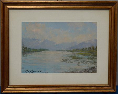 Giuseppe Mastellaro "Scorcio di Lago" 1974 olio su cartoncino (cm 13x20) firmato e datato in basso a sinistra, in cornice (difetti)