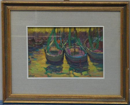 Ettore Frana "Barche nel porto" olio su cartone (cm 16x23) firmato in basso a...