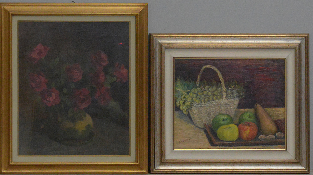 Lotto di due dipinti ad olio su tela raffiguranti nature morte di autori differenti (cm 40x50 e cm 60x50) (lievi difetti)