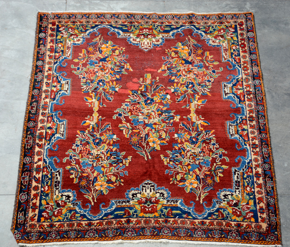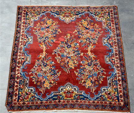 Tappeto Bachtiari, Persia secolo XX. Decoro floreale di ispirazione francese, policromo su fondo rosso granata (cm 186x154) (difetti, vecchi restauri)