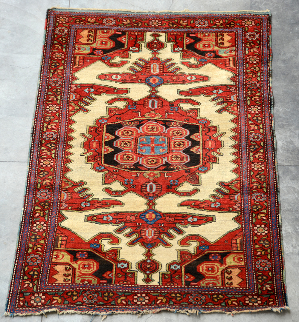 Tappeto Karadagh, confine Persia/Caucaso secolo XX. Decoro con grande medaglione rosso su fondo bianco (cm 191x130) (difetti)