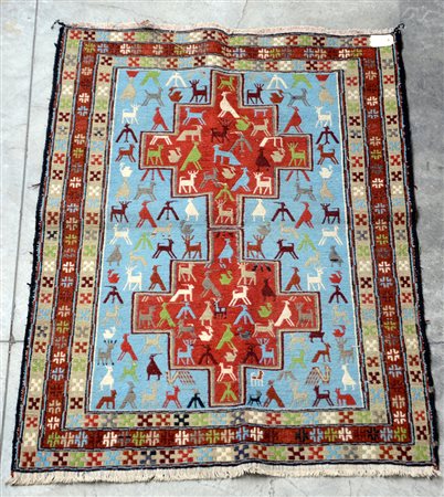 Tappeto Suamk, Persia secolo XX. Decoro ad animali stilizzati su fondo mattone con campo azzurro (cm 145x101) (difetti)