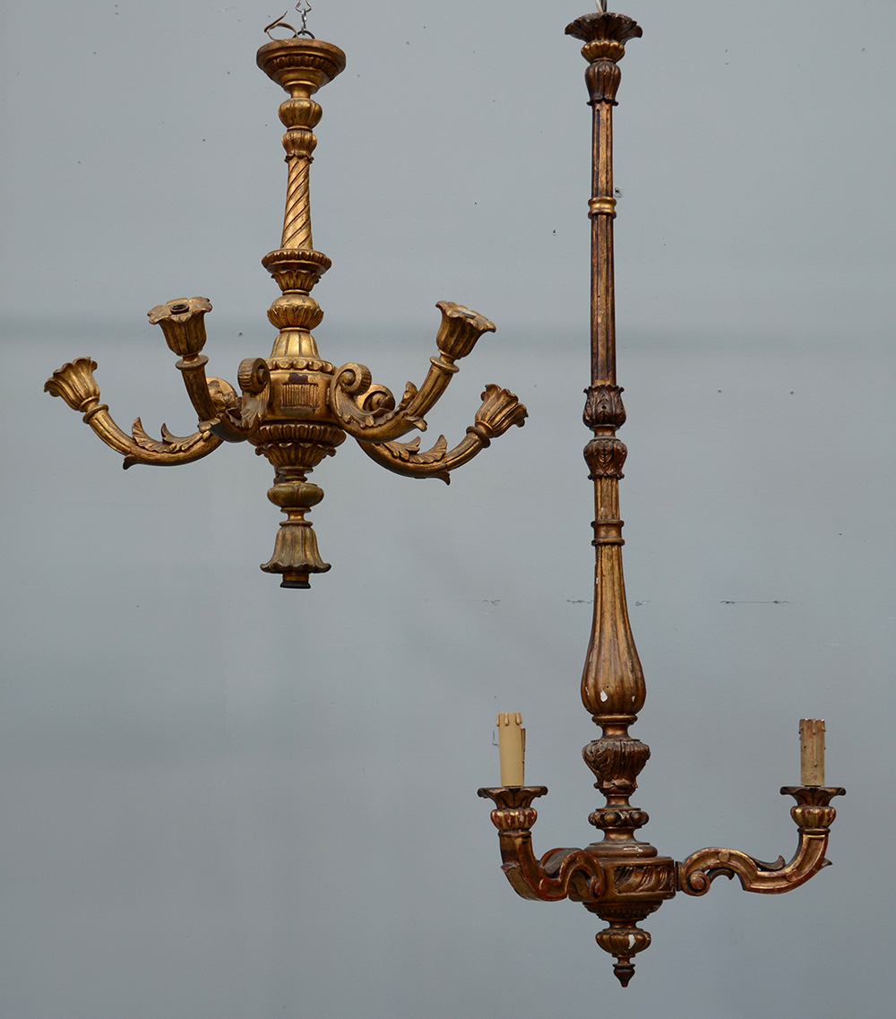 Lotto composto da due lampadari con bracci sagomati in legno intagliato e dorato, misure diverse (difetti)