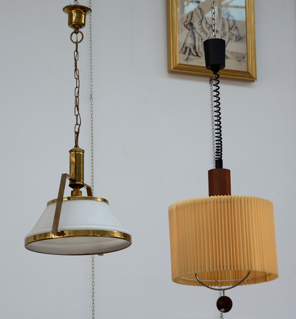 Lotto di due lampadari a sospensione a una luce. Italia, anni '70'/80. (misure diverse) (difetti)