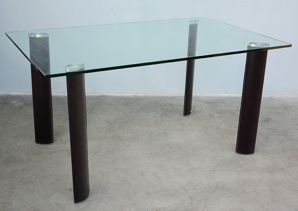 Tavolo con piano in cristallo e gambe rivestite in eco-pelle. Italia, produzione recente. (cm 150x75x90)