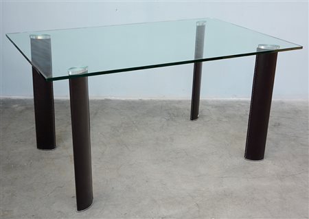 Tavolo con piano in cristallo e gambe rivestite in eco-pelle. Italia,...
