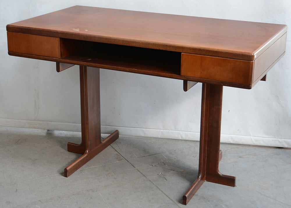 Scrittoio con due cassetti e un vano nella fascia in legno massello impiallacciato e bordato. Bovisio Masciago, anni '70. (cm 119x75,5x63,5) (lievi difetti)