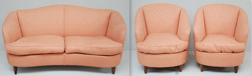Salottino composto da due poltroncine e un divano a due posti con struttura in legno e rivestimento in tessuto rosa. Italia, anni '50. (Poltroncine cm 64x81x70; Divano cm 64x81x70)