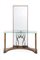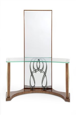 Toilette con grande specchiera e sedia. Base e montanti bordati e lastronati in mogano rivestito in pergamena, sostegno centrale a doppia voluta in fusione di bronzo patinata. Piano in cristallo molato di forte spessore. Sedia con schienale a doppia voluta in acero massello. Italia, anni '40. (Sedia: cm 47x79x49; specchiera: cm 148x108,5x45) (difetti)