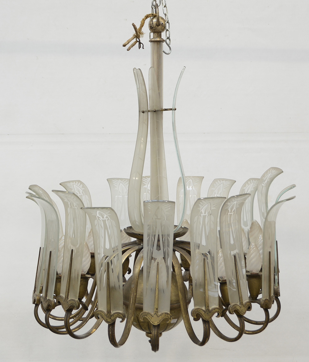 Lampadario in ottone a diciannove braccia con lastre diffusore in cristallo sabbiato con decori vegetali geometrizzati. Italia, anni '20. (h cm 76,5) (difetti e mancanze)