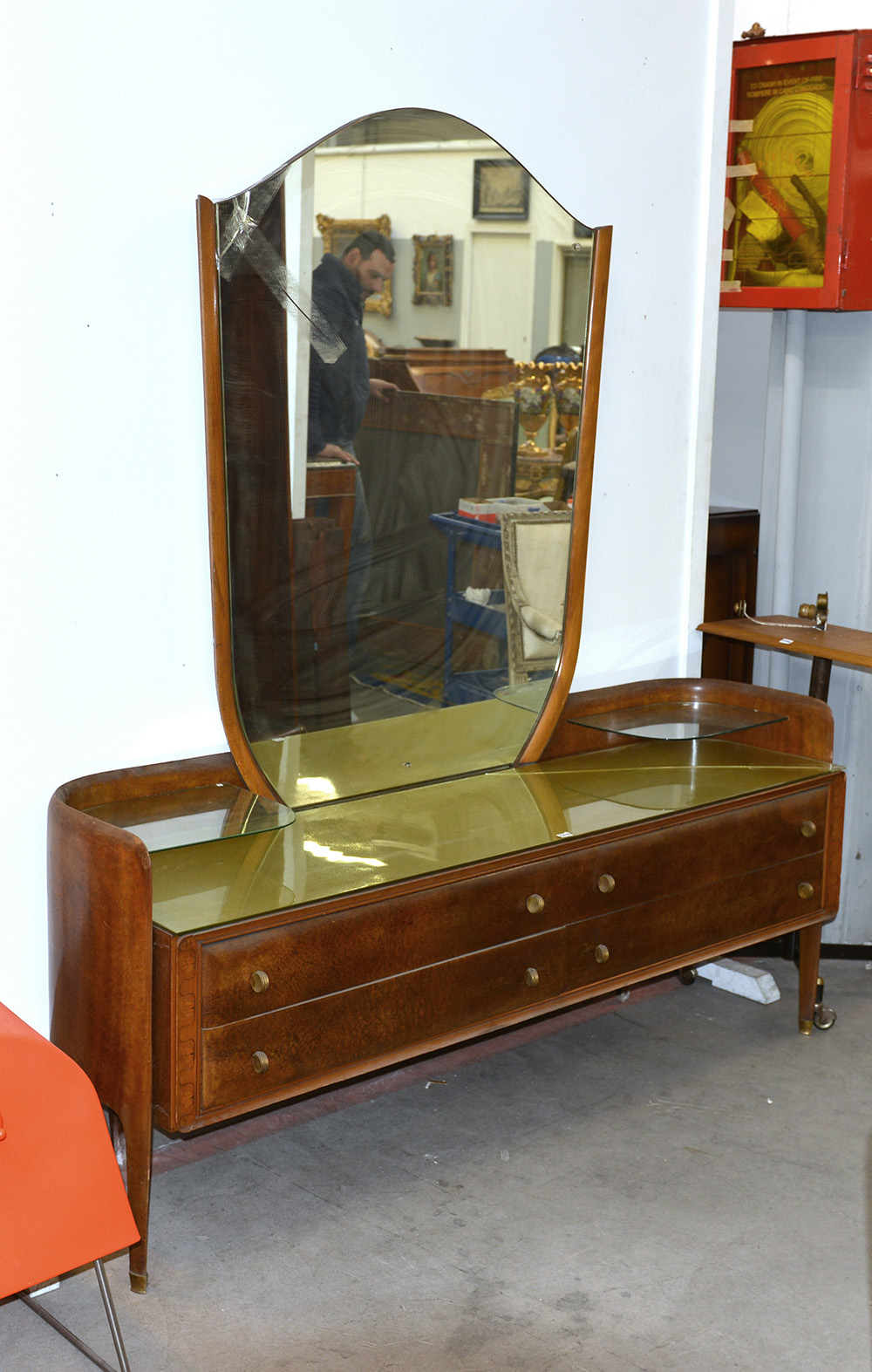 Cassettiera da camera con specchiera in legno e radica impiallacciato, bordato e intarsiato con motivi neoclassici a foglie di alloro, Piano in vetro retroverniciato oro, puntali e maniglie in fusione di ottone. Italia, anni '40/'50. (cm 167x180x50) (difetti)