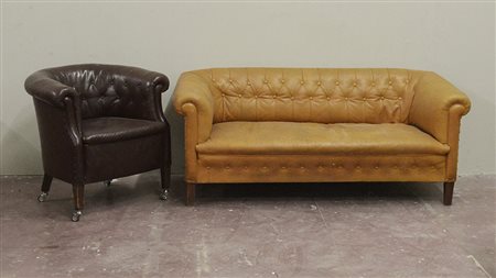 Lotto composto da un divano a due posti e una poltrona rivestiti in pelle capitonné. Italia, anni '70. (Divano cm 163x66x80; Poltrona cm 73x63x67) (difetti e mancanze)
