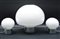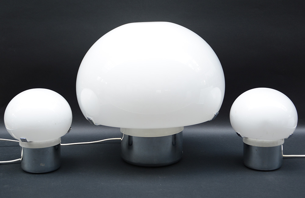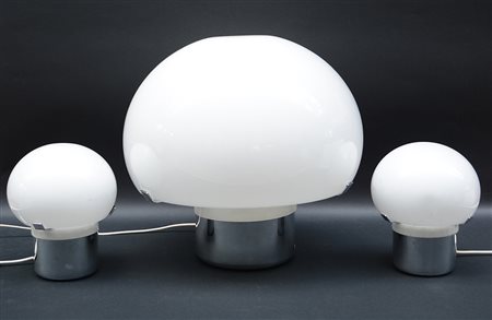 Lotto composto da una coppia di piccole lampade da tavolo con struttura in ottone cromato e metallo laccato bianco, paralume in metacrilato bianco, unite a una lampada piu grande analoga. Italia, anni '70. (h max cm 20; d cm 15) (lievi difetti)