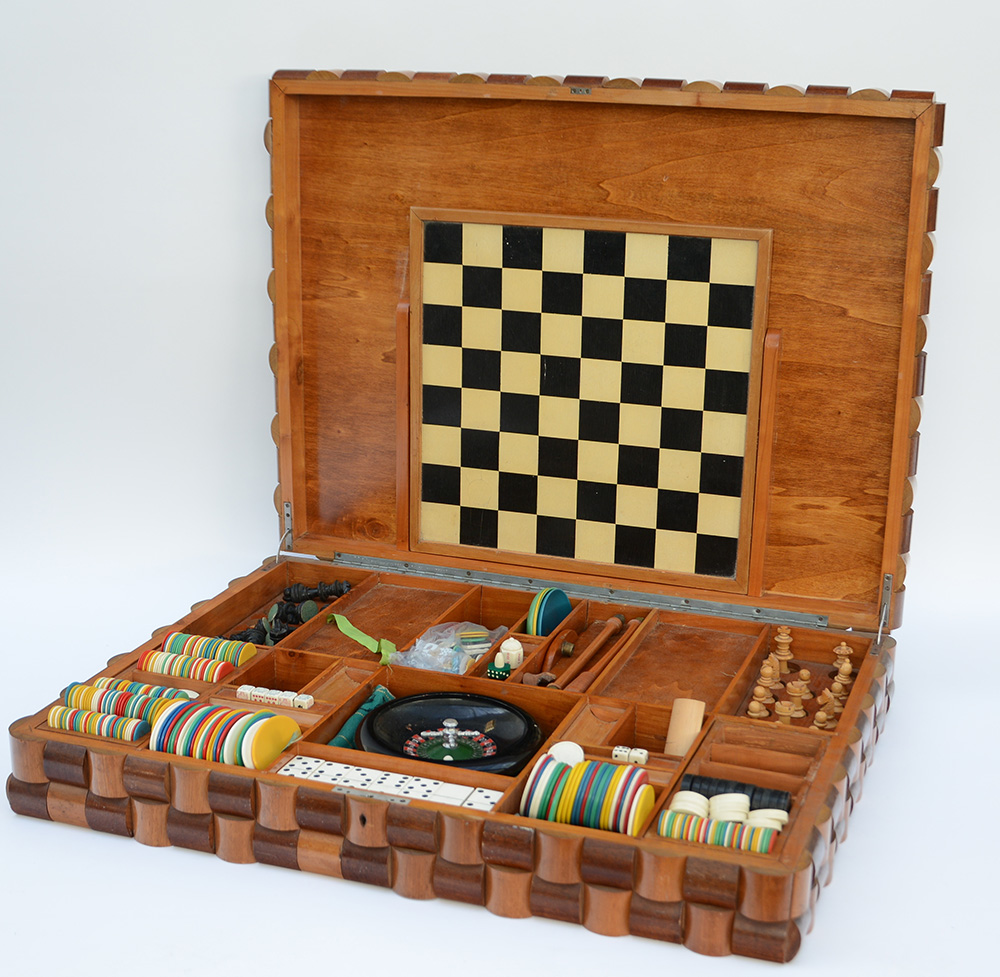 Scatola da gioco in legno di mogano a bugne semicilindriche contenente i giochi degli scacchi, dei dadi, della roulette con fishes e pedine. Italia, anni '40. (cm 64x12x49) (lievi difetti e mancanze)