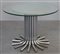 Tavolo tondo con piano in cristallo centrato da specchio, sostegno a fasce...