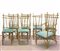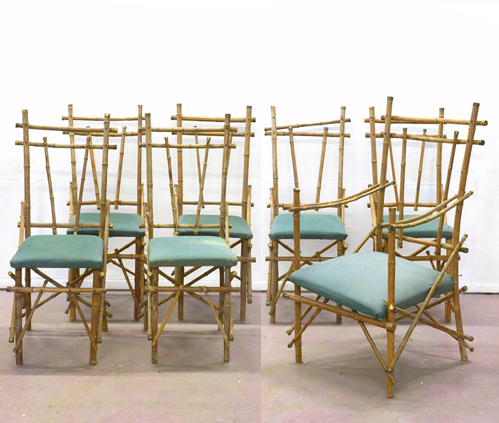 Lotto composto da sei sedie e una poltroncina in bamboo con puntali in ottone e seduta rivestita in tessuto verde. Italia, prima metà secolo XX. (Sedie: cm 44,5x104x54;