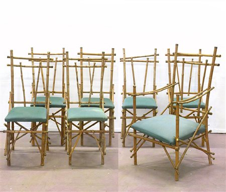 Lotto composto da sei sedie e una poltroncina in bamboo con puntali in ottone...