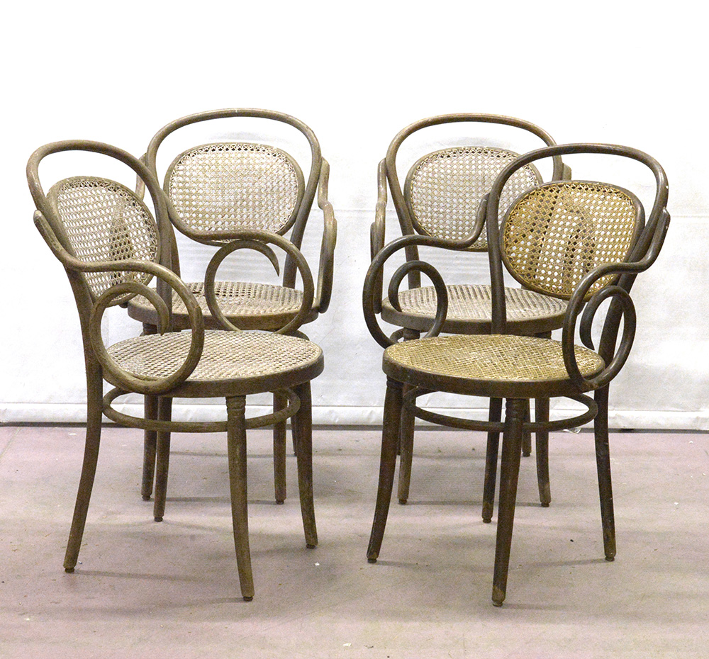 Gruppo di quattro poltroncine in faggio curvato al vapore con seduta in paglia intrecciata. Austria, inizio secolo XX. (cm 53x90x66,5) (Gravi difetti, restauri e mancanze)