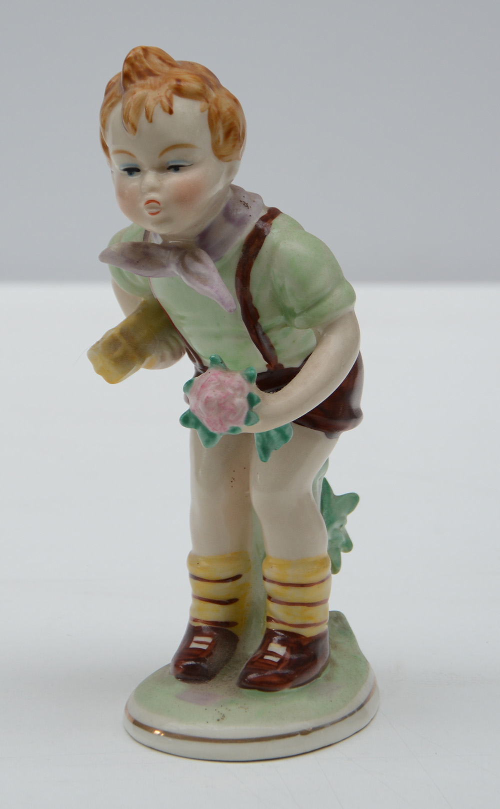 Scultura in ceramica sotto vetrina raffigurante un fanciullo con mazzo di fiori. Firmata sotto la base "KK 1888". (h cm 20)