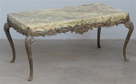 Tavolino da salotto in metallo decorato a motivi vegetali e fiori, piano lastronato in onice fiorito (cm 106x48x55) (difetti)