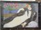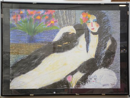Nudo di donna sdraiata con stola in pelliccia e fatto accucciato. Grande stampa a colori, in cornice (cm 110x155).