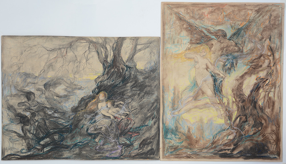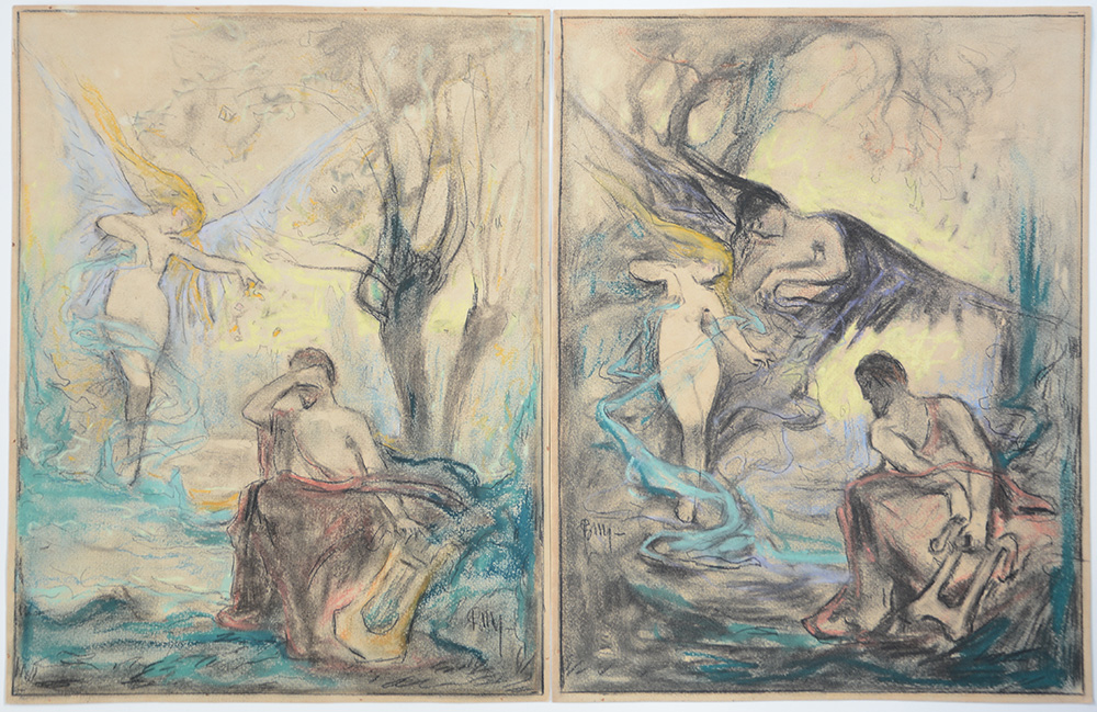 Lotto di quattro tecniche miste su cartoncino raffiguranti scene tratte dal mito di Orfeo ed Euridice (cm 28x35.5) Siglate in basso a destra e sinistra
