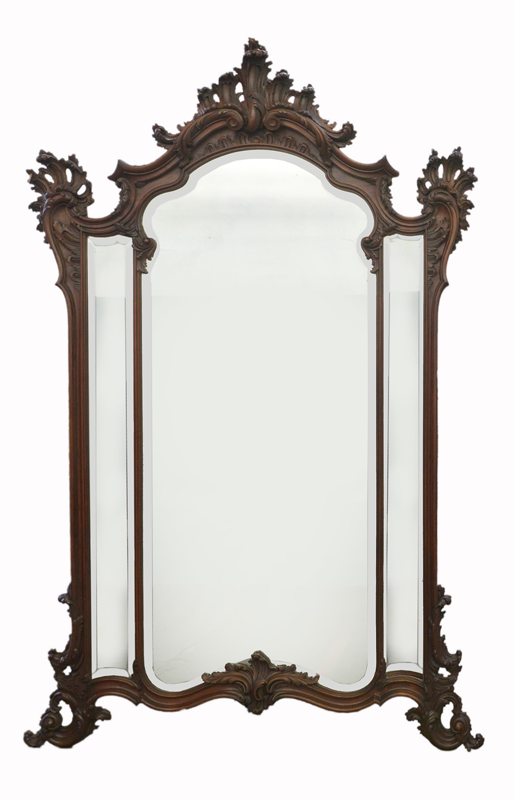 Specchiera di forma sagomata in legno ebanizzato e intagliato a volute e motivi vegetali, specchio tripartito (cm 230x152) (difetti)